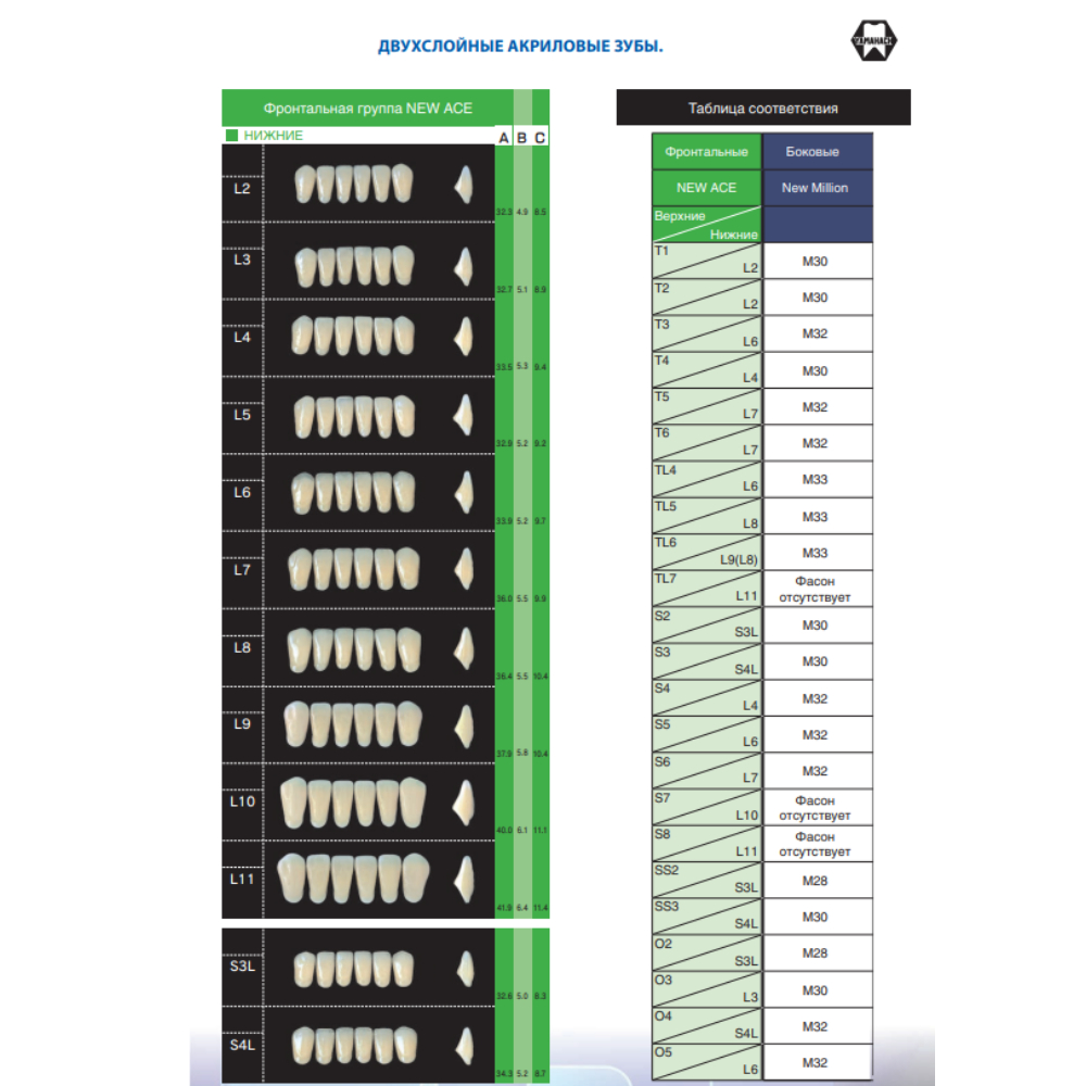 New Ace / New Million, фасон S3/S4L M30 — полный гарнитур акриловых двухслойных и однослойных зубов на одной планке от производителя Yamahachi.