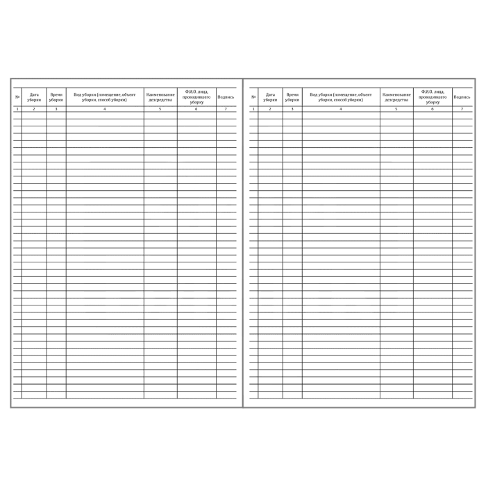 Каждый отдельный регион определяет форму журнала учета текущих уборок самостоятельно. Унифицированной формы Журнала учета текущих уборок не существует. Проведение текущей уборки может быть назначено на утро (до начала работы в помещении) или на вечер (по окончании работы в помещении), а также по мере загрязнения. Уборка должна проводиться с применением специальных дезинфицирующих средств и в спецодежде.В Журнале учета текущих уборок фиксируются дата и время уборки, тип уборки и убираемый объект, названия применяемых дезинфицирующих средств и данные работника.