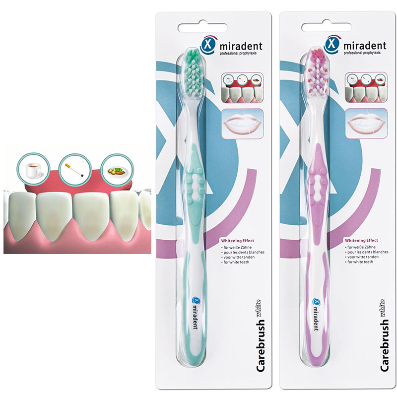Carebrush white от производителя Miradent — зубная щётка с эффектом отбеливанияю. Объединяет в себе преимущества обыкновенной зубной щетки с технологией профессиональной чистки зубов.