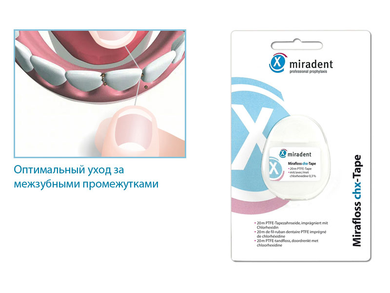 Зубная нить Mirafloss chx-Tape (флосс, импрегнированный диглюконатом хлоргексидина) от производителя Miradent – дополнительная превентивная защита от кариеса. Хлоргексидин оказывает быстрое и мощное бактерицидное действие и снижает образование зубного налёта. Этот факт подтверждён многочисленными исследованиями.